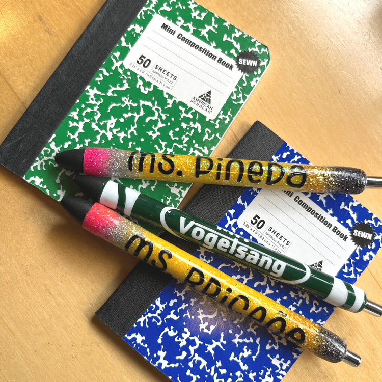 What a perfect gift for any teacher or school staff! InkJoy®️ Pen are covered in fun colors to create school-inspired designs. You can choose from the following styles: pencil, crayon, composition notebook. Style is created in your choice of color for extra personalization. Pens can also be created without glitter.