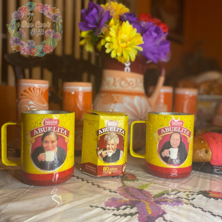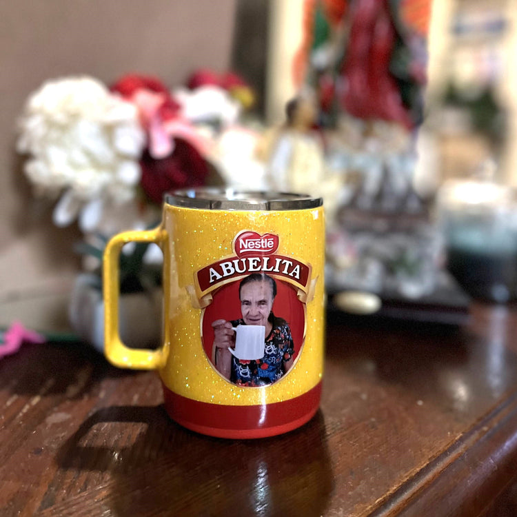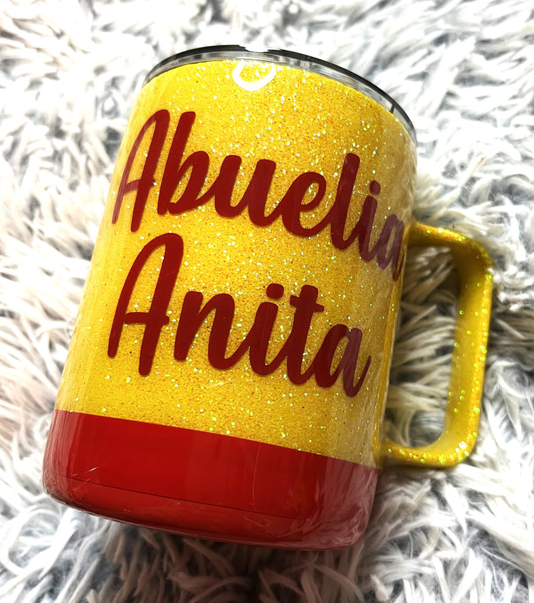 This perfect little mug will certainly warm your corazoncito. Perfect for your chocolate caliente to enjoy with your pan dulce. Personalized Abuelita Chocolate-Inspired mug with bright yellow glitter, red accents, and personalization on the opposite side. Mug can also be done without glitter as requested.