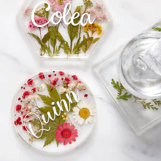 Beautiful dried flowers pressed in clear resin with choice of glitter color, or flakes of  gold, silver, or rose gold.  Coaster shape can be circle, square, or a fun  jagged geode-liked shape. Customized with your name or small quote in black lettering (unless other color specified).  Option to order set of 4 coasters or 6 is available. Please note that sets come in same design with different names. Please specify in "Personalization option on sets (Name/quotes only)"